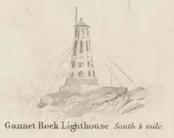 In 1824 the Legislative Assembly of New Brunswick passed a bill requiring that a lighthouse be built south of Grand Manan. Dangerous shoals in the area were a hazard to ships entering the Bay of Fundy en route to the port of Saint John, New Brunswick.[6] The Commissioners of Lighthouses built wooden test structures on Yellow Murr Ledge and Gannet Rock, and when the former was washed away it was determined that Gannet Rock would be the best location for the lighthouse,[7] for which £1000 had been allocated. The rock islet 8 miles (13 km) south of Grand Manan is 40 feet (12 m) high and approximately 300 feet (91 m) long at high tide.[8] The lighthouse was built in 1831 and the light was first lit in December of that year.[6]