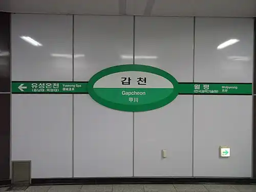 Gapcheon Station (Korean: 갑천역; Hanja: 甲川驛) is a station of the Daejeon Metro Line 1 in Wolpyeong-dong, Seo District, Daejeon, South Korea. It has two functional platforms. It was opened on April 17, 2007. It is located on the river side and on the Gapcheondosi Expressway.