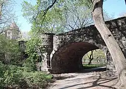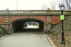 1859[53] | Center Drive | Pedestrian path | 24 feet (7.3 m) | 65 feet (20 m) | 11 feet (3.4 m) | Driprock Arch carries Center Drive over what was formerly a bridle path,[53][54] and before that, the former course of a mill stream that ran into what is now the Pond.[55] The bridle path was demolished in the 1930s when Heckscher Playground was expanded, and a pedestrian path now passes underneath Driprock Arch. The arch contains a red-brick vault, spandrels, and revetments, as well as sandstone trim.[53][56] There are sandstone rosaries set into the vault's ceiling.[55] |