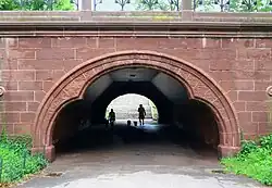 1861[103] | East Drive | Pedestrian path | 49 feet (15 m) | 14 feet 10 inches (4.52 m) | 9 feet 10 inches (3.00 m) | Willowdell Arch, a brick bridge, is faced with brick and contains a sandstone trim, like the Driprock Arch. It contains rusticated voussoirs and brick coffers in the vault.[104][105] A fountain was once located in a niche on the northern wall of the vault.[105][103][106] |