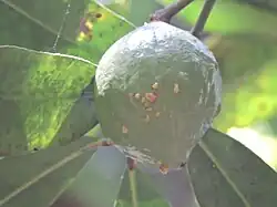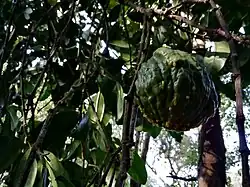 They are large trees almost 20 m tall, with pyramidal crown; Branchlets are tetragonous with dark brown colour. The latex of the species is milky and the whole plant is glabrous except for the sepal and petal margins. Leaves are 14–20 × 6–8 cm, elliptic-oblong shaped, coriaceous, base rounded, margin subrepand, acute or obtuse at apex, dark green above, and light green below. The leaves have about 30–34 pairs of lateral nerves, the petiole is 1.5–2 cm long and quadrangular; and stipules are intrapetiolar. Flowers are pinkish-white in colour. Fruit size is almost 12 × 11 cm, arranged perpendicular to the axis at maturity. Fruits are fleshy, without any pulp, and irregularly ridged on the surface. It is symmetric and pale brown with a distinct papilla at apex. The seeds are plano-convex in shape, smooth or rugose, and whitish-yellow colour. The size is 2 × 1 cm with light brown and papery seed coat.[1]
