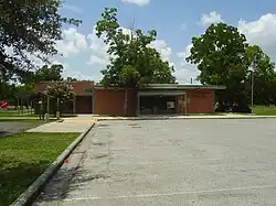 The Garden Villas Park, classified as a "Community Park" by the City of Houston, is located at 6720 South Haywood Drive.[25] Garden Villas Community Center, located on the same lot, has an outdoor basketball pavilion, a lighted sports field, a playground, a volleyball court, and a .49 mile hike and bicycle trail.[26] The park facilities were built in 1959 by William R. Jenkins. As of 1988 the recreation building was a nine-square grid one. Stephen Fox of Cite said that "does get a little stretched in the middle to accommodate the program."[2] As of 1988 the community center has two steel-framed pavilions with articulated structural outrigging. Fox said that the pair of the pavilions "isn't just Miesian, it's Miesian-Palladian."[2] Fox added that "the lofty basketball pavilion provides the classical temenos-like space that Mies could always be counted on to deliver."[2] In addition Carter Park is also in Garden Villas. It has a 60-foot (18 m) baseball court and standalone swing sets.[27]