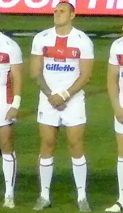 In September 2008, he was named in the England training squad for the 2008 Rugby League World Cup,[9] and in October 2008 he was named in the final 24-man England squad.[10] He was named in the England team to face Wales at the Keepmoat Stadium, Doncaster, before England's departure for the 2008 Rugby League World Cup.[11] He went with the England squad to compete in the 2008 Rugby League World Cup tournament in Australia. Group A's first match against Papua New Guinea he played at second-row in England's victory.