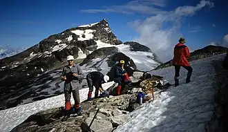 The Huntley Col trail starts at Four and a Half Mile Campground on the north shore of Azure Lake. It goes straight up the mountain without the pleasantry of switchbacks and is a steady grind of 1,370 m (4,495 ft) to the Col. This climb takes at least five hours with backpacks. Huntley Col, between Mount Huntley to the west and Batoche Peak to the east, is the best place to camp since there is a year-round snow patch for water and it is sheltered from the near constant wind. On the second day, the route contours along the north side of Batoche and Tryfan, then traverses the hogsback north to Garnet. The climb itself is mostly on the southwest ridge with one rock pitch of 25 m (82 ft) where a rope and pitons are necessary and a rappel on the descent. The round trip from Huntley Col to the summit takes about 12 hours. The third day is the descent to Azure Lake. The optional fourth day is a cushion in case of bad weather, or it can be used for a hike along the Huntley-Buchanan Ridge as far as Tryfan Mountain. For a detailed description of the Garnet Peak climbing route, see Exploring Wells Gray Park, pages 239-241.[1]