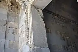 The exterior of the temple is richly decorated. The triangular pediment contains sculptures of plants and geometrical figures.[154] The frieze depicts a continuous line of acanthus. Furthermore, there are ornaments on the capital, architrave, and soffit. The stones in the front cornice have projecting sculptures of lion heads.[155] Sirarpie Der Nersessian argued that its "rich acanthus scrolls, with interposed lion masks and occasional palmettes, the fine Ionic and acanthus capitals, the other floral and geometric ornaments, are typical of the contemporary monuments of Asia Minor."[156]