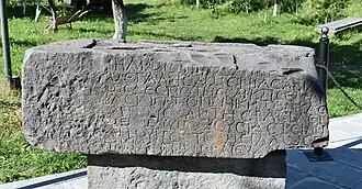 The walls of the temple bear six Arabic inscriptions in the Kufic style and one in Persian in the naskh script, which have all been paleographically dated to the ninth to tenth centuries.[68][24] They commemorate the capture of the fortress and may point to the temple's conversion into a mosque.[36] On its entryway, there is a large Armenian inscription from 1291, left by Princess Khoshak of Garni and her son, Amir Zakare. Khoshak, the granddaughter of Ivane I Zakarian, recorded the exemption of the people of Garni from taxes paid in wine, goats, and sheep.[69][m]