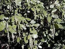 The plant is dioecious, with male and female plants producing long, hanging clusters of yellowish to pinkish flowers.