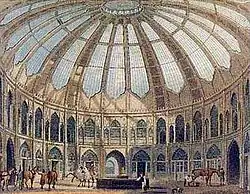 The ground plan of these stables was designed by us (Loudon) in 1809 for the late Col. Mytton of Garth, Montgomeryshire; and it is proper to observe the principal object in view was, to provide accommodation for breeding and breaking of a superior description of riding horses. The situation on which these stables were placed was the summit of an elevated knoll, protruding from the side of a hill; and their effect was remarkably good from all the surrounding country. The elevation actually executed from our design was different from either of those now given (figs 1702 and 1703), and, we need not say, much inferior; the later having been suggested and sketched for us by Barry, and prepared for the engraver by Mr Lamb. Fig 1702 is in the Italian style and fig 1703 is in Tudor Gothic. The form of a riding-house is generally that of a parallelogram:though that at Brighton, some in London and the veranda at Garth ...are circular.