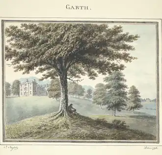 Garth is a historic site of considerable antiquity. It may have been the home of Sir Griffith Vychan who had fought at Agincourt in 1415,[4] and was descended from Brochwel Ysgithrog, Prince of Powys. Humphrey Wynn of Garth who was buried in September 1579 was fourth in descent from Gruffydd Fychan. His descendant was Brochwel Wynn who died in April 1717 leaving a 14-year-old heiress, Dorothy. She was quickly drawn into marriage with the 33-year-old squire of Pontysgawrhyd, Richard Mytton, in July 1717.[5] With this marriage, Garth passed to the Mytton family. Richard Mytton extended the estates by purchases in the decades leading to his death at the age of 90 in 1773, and this process of expansion was continued by his son Devereux Mytton in the years leading to his death at the age of 84 in May 1809. His son Richard died before him in 1802, and his heir was therefore his young grandson, Richard, born in 1783. Shortly after he came of age, the young Richard Mytton entered into an unpleasant case in the Chancery Court, where he accused his grandfather of committing waste on the estate in the felling of timber worth £3,200. The case is interesting in that it sheds light on Devereux Mytton's purchasing of lands and his building of a new house at Garth about 1775.[6]