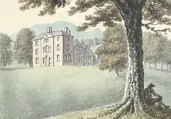 In July 1786 Thomas Pennant passed the house on a tour through Montgomeryshire. He records The Country from Poole (Welshpool) towards Llanymynach is most beautifully broken into gentle rising, prettily wooded. .....Pass by the Garth, the seat of Devereux Mytton, Esq. Pennant had a particular interest as he was related to William Mytton of Halston, an antiquary, whose notes he used extensively. Pennant in 1796 commissioned John Ingleby to produce a watercolour of the old house at Garth, which presumably he intended to use as an illustration for a future edition of the Tour in Wales. This watercolour, which is now in the collections of the National Library of Wales, appears to be the only surviving depiction of the old hall, shown on a hill in the wooded countryside.[15] Ingleby's watercolour shows that a new house had been placed in front of earlier buildings, possibly timber-framed, of the Wynn family. This new house was built about 1775 by Devereux Mytton, probably about the time of his second marriage to his distant cousin Eleanora Devereux.[16]