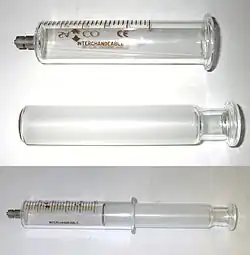 A gas syringe has an inner syringe chamber which has a ground glass surface. The syringe barrel also has a ground glass surface. The ground surface of the barrel moves freely within the ground glass surface of the syringe chamber with very little friction. The close mating of these ground glass surfaces also gives a reasonably gas-tight seal.[3] Like a ground glass stopcock, the two parts of a gas syringe should preferably not be interchanged with another gas syringe of the same volume, unless told otherwise by the distributor.[3] Gas syringes come in various sizes from 500 ml to 0.25 ml and tend to be accurate to between 0.01 and 1 ml, depending on the size of the syringe.[4]