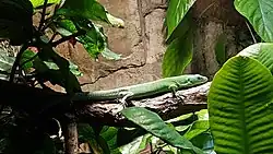 The green keel-bellied lizard is a slim, bright green lizard with a long prehensile tail that accounts for about 70% of its body length. The scales on its back are small, smooth and non-overlapping, and emerald-green in colour. The scales on its underside are yellow-green and keeled. There are patches of turquoise around its limbs, and occasionally black speckled lines along the sides of its body and black speckles on its tail. Its tongue is bright red.[2]