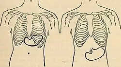 The condition frequently causes digestive symptoms, epigastric pain, constipation, decreased appetite, and sometimes even gastric emptying disorders.[2] It is much more prominent in women than men, and is diagnosed with x-ray using barium contrast.[1][3] Gastroptosis is mainly caused by the relaxation of surrounding ligaments and mesenteries as a result of the weight of the stomach.[4]