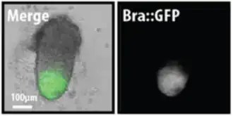 Brachyury (T/Bra), a gene which marks the primitive streak and the site of gastrulation, is up-regulated in the Gastruloids following a pulse of the Wnt/β-Catenin agonist CHIR99021[10] (Chi; other factors have also been tested[1]) and becomes regionalised to the elongating tip of the Gastruloid. From or near the region expressing T/Bra, cells expressing the mesodermal marker tbx6 are extruded from the similar to cells in the gastrulating embryo; it is for this reason that these structures are called Gastruloids.[1]