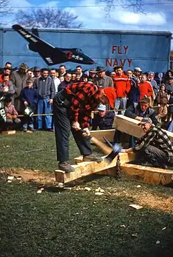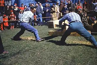 - The lumberjack competition includes a series of events such as axe throwing, bow sawing, block chopping, and a Jack and Jill style cut. Both men and women can participate in all of these events. The Jack and Jill race involves one man and one women on each team competing to see who can saw through a piece of wood the fastest.