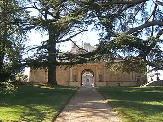In 1934, The 2nd Lord Faringdon employed Hyslop to remodel Buscot Park and restore it to an approximation of an 18th-century appearance. This was achieved by removing the 19th-century extensions and alterations which obscured the clean and simple lines of the neoclassical house. To restore some of the space lost by the demolition of a large wing, Hyslop created two flanking pavilions in a classical style, "which suit the house to perfection", John Julius Norwich observed,[4] with temple fronts to the south and north. The pavilions and house were given a unified composition by linking high box hedging, complete with topiary pilasters. The interior of the mansion received a similar treatment: Victorian decoration was removed and 18th-century ceilings, fireplaces and motifs were acquired and installed. Small rooms were merged to accentuate the sense of light and space needed to accommodate Lord Faringdon's large political houseparties.[5]