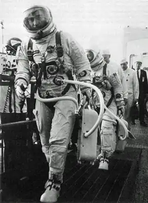 ![]() Astronauts John Young and Gus Grissom walk up the ramp leading to the elevator that will carry them to the spacecraft for the first crewed Gemini mission | |