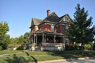 The Gen. Cass and Belle Smith House, also known as the Smith-Jacobs House, is a historic dwelling located in Lake City, Iowa, United States. G.C. Smith was born in Lake City in 1861, and his parents Peter and Sarah were pioneer settlers here.[2] He was a local businessman who married Lottie Belle Huff in Lake City. They had this 2½-story, brick, Queen Anne house built in 1901. John W. and Bertha Jacobs bought the house from the Smiths in 1913. He was a local attorney and politician. They lived in the house into the mid-1960s. The house was designed by a Racine, Wisconsin architect whose last name was Flagel. The high degree of integrity makes it significant.[2] The asymmetrical, cross-gable structure has a prominent porch on the southeast corner. Between the first and second floors is a beltcourse of rough brick, and there is a bracketed cornice at the roofline. The house was listed on the National Register of Historic Places in 1990.[1]