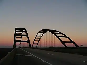 The General W.K. Wilson Jr. Bridge, more commonly known locally as the "Dolly Parton Bridge", consists of dual parallel tied through arches of weathering steel and beam viaducts of concrete that form one continuous span carrying four lanes of Interstate 65 across the Mobile-Tensaw River Delta northeast of the U.S. city of Mobile, Alabama. Built from 1978 to 1980, it spans a distance of 6.08 miles (10 km) over the delta, making it, along with the Jubilee Parkway across Mobile Bay to its south, among the longest bridges in the nation. It was named in honor of Walter K. Wilson, a Chief of Engineers with the United States Army Corps of Engineers and long-term resident of Mobile.[2] He was credited with being one of the first people recognizing the need to construct a high-level bridge on Interstate 65 over the Mobile River that would not impede waterway development. The state of Alabama named the bridge in his honor after completion of construction in 1978.[3]