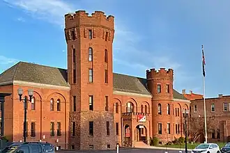 Geneva Armory is a historic National Guard armory building located at Geneva in Ontario County, New York. The armory consists of a long, shallow, rectangular, five-story, hip-roofed administration building with an attached 1+1⁄2-story, rectangular gable-roofed drill shed. The original section of the administration building was built in 1892 and designed by architect Isaac G. Perry. It was tripled in size in 1906 and the addition included a slightly off-center 10-sided, 4+1⁄2-story castle-like tower.[2]