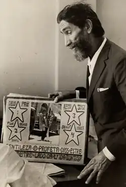 On Sunday, 17 December 1961, in the municipality of Niterói, there was a major fire at a circus, called considered one of the largest circus disasters in history.[3] This fire killed more than 500 people, mostly children. On the eve of Christmas, six days after the event, José woke up claiming to have heard "astral voices", in his own words, that commanded him to leave the material world and devote himself only to the spiritual world. The Prophet took one of his trucks and went to the fire scene, where today is the Niterói Military Medical Services. He planted a garden and a vegetable garden on the ashes of the Niterói circus, a place that was once the scene of so much joy, but also of great sadness. That place was his home for four years. There, José Datrino instilled in people the real meaning of the words Thankful and Kindness (respec. Agradecido and Gentileza). He was a comforter volunteer, who helped the victims families with his words of goodness. From that day on, he came to be called "José Agradecido", or "Profeta Gentileza".[2]