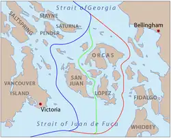 Hornby had no patron once the Aberdeen ministry came to power in December 1852 and instead cared for his father's estate at Lordington and played no part in the Crimean War.[2] Following a change of government, Hornby became commanding officer of the frigate HMS Tribune on the Pacific Station in August 1858.[2] When he arrived at Vancouver Island with a naval brigade, he found that a unit of American troops was about to take over the San Juan Islands in a dispute known as the Pig War.[3] Hornby used his powers of diplomacy to facilitate a peaceful handover of the islands to the United States.[3]