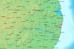 Two rivers meander through Chennai, the Cooum River (or Koovam) in the central region and the Adyar River in the southern region. Both rivers are heavily polluted with effluents and trash from domestic and commercial sources. The Adyar, which is much less polluted than the Cooum, is de-silted and cleaned periodically by the state government. A protected estuary of the Adyar forms the natural habitat of several species of birds and animals. The Buckingham Canal, 4 km (2.5 mi) inland, travels parallel to the coast, linking the two rivers. The Otteri Nullah, an east–west stream runs through north Chennai and meets the Buckingham Canal at Basin Bridge.[18] Several lakes of varying size are located on the western fringes of the city. Red Hills, Sholavaram and Chembarambakkam Lake supply Chennai with potable water. Groundwater sources are mostly brackish. A study by the Department of Geology, Anna University, based on a city map of 1893, has revealed that there were nearly 60 large waterbodies in the core of then Madras.[19] The study traced the shrinking and vanished waterbodies through a series of city maps.[20]