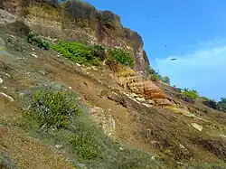 Unlike the flat portion of the Kerala coast, at the northern coastal region cliffs are found adjacent to the Arabian Sea at Varkala.[5] These tertiary sedimentary formation cliffs are considered as a unique geological feature. It is known among geologists as the "Varkala Formation" and a geological monument as declared by the Geological Survey of India.