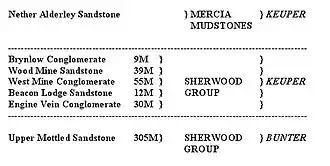 Two other minor beds are seen to the southeast of these areas a single cycle conglomerate/sandstone/marl of 9 m thickness known as the Brynlow conglomerate and a final bed that overlies the Brynlow Conglomerate and is named the Nether Alderley Sandstone. On top of the Nether Alderley Sandstone lie the Mercia Mudstones which attain a thickness of 300 m, but these are only seen on the lower plains, it is in these beds that the halite lies.
