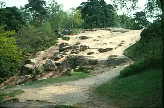 By the start of the Triassic period, around 252 million years ago, the Zechstein Sea of the Permian period had retreated and the climate had become a little wetter giving a gentle transition making the Permian-Triassic boundary uncertain in northern England as there are no fossil horizons or facies changes that make a definitive separation possible as there in continental Europe. The horizon however is characterised by a succession of red marls (calcareous mudstones) deposited on coastal flats, followed by the Sherwood Sandstone (formerly Bunter Sandstone). The 'British Isles' were not islands, but had an intra-continental position within Pangea. The area that now constitutes Great Britain was drifting northwards as Pangea rotated, was at a latitude of 10° – 20° north, equivalent to the latitude of the present day Sahara desert. Erosion of the then recently uplifted landmass formed Aeolian deposits in the southern and central parts of the country. This iron-rich silica sandstone was both oxidised and reworked to give it its red colouration and its name, "New Red Sandstone". British deposits of the era consist of these red beds, alluvial, fluvial and lake deposits, with some shallow-water marine and evaporite deposits. These Permo-Triassic outcrops can be seen on either side of the Pennines and in Devon. Within the main central England basin (Staffordshire and Cheshire), the deposits are dominated by pebbly sandstones and conglomerates (Chester Pebble Beds, Wilmslow and Wildmoor Sandstones), which have been interpreted as the deposits of a fluvial system running within well-confined channels. The Sherwood Sandstone Group comprises a series of conglomerates, coarse sandstones and mudstones. The Chester pebble beds to the south of Alderley represent material deposited in alluvial fan or braided river system.[7] The finer sediments of the Wilmslow and Helsby Sandstone to the west of Alderley represent alluvial deposits of low sinuosity channels. The Alderley area represents the midpoint between the full braided river system and the lower energy area. Minor aeolian dunes and channel infill deposits in the Wilmslow Sandstones indicate an inter channel area or seasonal drying of some of the minor river channels.
