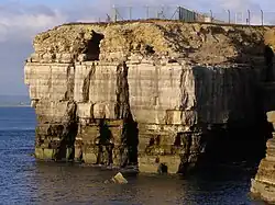The Portland sands were created in a deep marine environment, whereas the Portland stone was a near-shore deposit.[39] The lower Portland sand formation, usually greyish-blue in colour, consists of dolomite beds best viewed on the West Weares, Gad Cliff, and Hounstout. The overlying Portland stone is a distinctive white oolite containing thick-shelled fossils and marine algae.[40] The marine algae, which formed large reefs, are responsible for the occasional stacked and arched bands in the formation and are best viewed in the Roach, an extremely fossiliferous limestone confined to the north of Isle of Portland.[41]