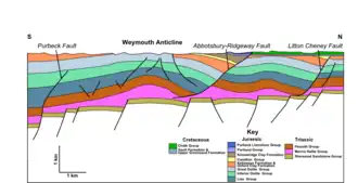 The Weymouth Anticline has a west–to-east-trending axis and plunges to the east. Strata beneath the Upper Triassic halite are unfolded, indicating that the salt is acting as a decollement. The anticline is a result of inversion along the Abbotsbury–Ridgeway Fault, although it may have developed by the tightening of an earlier rollover anticline, formed during an earlier extensional phase, due to the soft-linked nature of the faulting.[78]