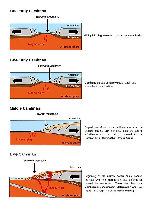 In the Early Cambrian to Late Cambrian, the Ellsworth Mountains were located in an ensialic rift basin at the paleo-Pacific boundary of Gondwana. It is dominated by the siliciclastic Heritage Group, a syn-rift fill.[5] There are also localised occurrences of Middle Cambrian extensional growth faults, block tilting, and associated intraformational unconformities. These have been shown to be closely related to the rift-related basaltic volcanic and subvolcanic rocks' extrusion and intrusion.[16] A location with consistently sinking sedimentary strata in the Liberty Hills Formation is the High Nunatak, Horseshoe Valley. The formation is intruded by basic dikes from upper Middle Cambrian rift volcanoes and features a number of extensional growth faults that range in size from decimeters to metres.[16] The claim is supported by stratigraphic evidence that crosses the contact in some places and demonstrates structural continuity between the two sedimentary groups.[5] Additionally, it is stated that the Heritage Group was unaffected by the end-Cambrian orogeny and that the boundary indicates the change from rifted to passive margin.[16]