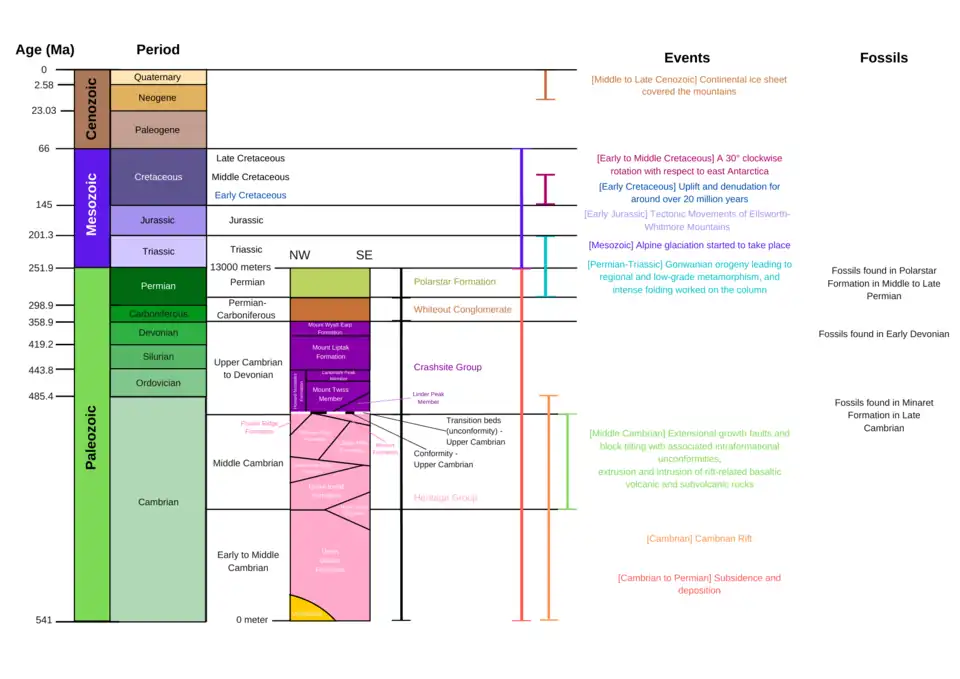 The geology of the Ellsworth Mountains and the Middle Cambrian to Permian are related, as shown by the tectonostratigraphic history of the Cape fold belt.[18] Before the Ordovician, these areas were a part of a Middle to Late Cambrian rift basin setting that, with the emplacement of the Cape Supergroup and the Crashsite Group, transformed into a passive margin.[18]
