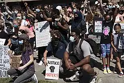 Smaller protests took place outside New York City. In Buffalo, video footage circulated on the Internet of police shoving an elderly man which caused him to fall to the ground and walk away as he bled from the head. This led to two officer suspensions.[124] On June 6, there was a large number of protests across the North Country, along with dozens of other cities across the country, attracting thousands of local protesters, with all the protests remaining peaceful. At the June 6th protests, the participants all took a knee for nine minutes, in silence, in respect for George Floyd. The period of time was equivalent to about the same amount of time that Derek Chauvin had his knee in Floyd's neck.[125][126]
