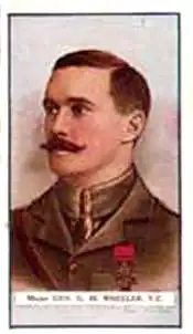 He was Major in the 7th Hariana Lancers, British Indian Army, during World War I. On 12 April 1915 at Shaiba, Mesopotamia, Major Wheeler led his squadron in an attempt to capture a flag which was the centre-point of a group of the enemy who were firing on one of his troop's picquets. He advanced, attacked the enemy's infantry with the lance, and then retired while the enemy swarmed out of hidden ground where Royal Artillery guns could attack them. On 13 April Major Wheeler led his squadron to the attack of the North Mound. He was seen far ahead of his men, riding straight for the enemy's standards, but was killed in the attack. Major Wheeler was 42 years old at the time of this action, for which he was awarded the VC.[3][4]
