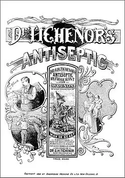 Tichenor developed his antiseptic formula in Canton, Mississippi, and thereafter practiced medicine in Baton Rouge, Louisiana, from 1869 to 1887. He started bottling Dr. Tichenor's Patent Medicine in New Orleans; the formula, consisting of alcohol, oil of peppermint, and arnica, was originally marketed as useful for a wide variety of complaints for both internal and external use for man and animal. A patent was registered in 1882.[3] The company producing this liquid was incorporated in 1905 and is still in existence, though the recommended uses are now more modest: principally as a mouthwash and topical antiseptic.