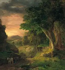 In his teens, Inness worked as a map engraver in New York City, first for Sherman & Smith, and then N. Currier.[8] During this time he attracted the attention of French landscape painter Régis François Gignoux, with whom he subsequently studied.[6] Throughout the mid-1840s he also attended classes at the National Academy of Design, and studied the work of Hudson River School artists Thomas Cole and Asher Durand; "If," Inness later recalled thinking, "these two can be combined, I will try."[9] He debuted his work at the National Academy in 1844.[6]