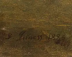 After Inness settled in Montclair, New Jersey in 1885,[20] and particularly in the last decade of his life, he expressed this mystical component by a more abstracted handling of shapes, softened edges, and saturated color (October, 1886, Los Angeles County Museum of Art), a profound and dramatic juxtaposition of sky and earth (Early Autumn, Montclair, 1888, Montclair Art Museum),[21] an emphasis on the intimate landscape view (Sunset in the Woods, 1891, Corcoran Gallery of Art), and an increasingly personal, spontaneous, and often violent handling of paint.[22][23] It is this last quality in particular which distinguishes Inness from those painters of like sympathies who are characterized as Luminists.[24]