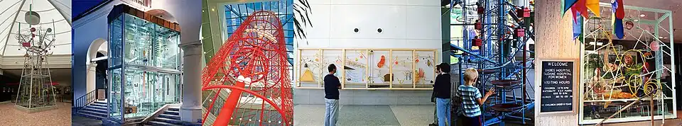 Rhoads' sculptures have been installed in public spaces and private collections around the world.[9] The pieces range in size from small wall-mounted sculptures to machines that fill entire rooms and span multiple stories.[12] Some of his work belongs to permanent museum collections at institutions like the Museum of Modern Art in New York and the Art Institute of Chicago.[6] Nearly all of his sculptures are still in operation and they have been noted for their popularity with the public.[9]