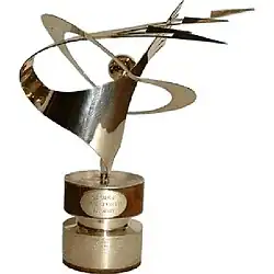 The Stainforth Trophy was designed by Robin Beresford. The trophy depicts in silver three supersonic aircraft and spiralling vapour trails soaring into the stratosphere.[1] The artist also tried to display an awareness of the achievements of the Schneider Trophy Team in the design, being aware that these achievements resulted in the improved design and development, by R. J. Mitchell, of the Spitfire, which played such a major role in Britain's victory in the Second World War. In the design of the trophy, the artist has tried to show the Earth as seen by the astronauts, vapour trails ending in arrows to depict high speed altitude flight, and with an outward sweep to infinity, which suggests that the sky is literally the limit of man's achievement in the air. Into his design, he has incorporated a star and its orbit to evoke the achievements of science and the Royal Air Force motto Per ardua ad astra.[4]