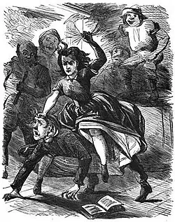 Revenge pranks are a common theme in the Sut Lovingood tales. In "Parson John Bullen's Lizards," for instance, Parson Bullen, a fire-and-brimstone preacher, beats Sut with a club after catching him in the bushes with a girl at a camp meeting. Later, when Bullen is preaching to a large crowd, Sut releases several lizards, which crawl up Bullen's legs, prompting him to strip off his clothes in terror.[13] Another target of Sut's revenge is Sicily Burns, a mountain woman who tricks Sut into drinking baking soda. In response, Sut causes a bull to wreak havoc at Sicily's wedding.[14]