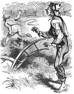 Harris was a strong Democrat, and his political writings either extolled Democratic leaders or lampooned leaders of opposing parties, namely the Whigs and Republicans.[16] In his 1856 story, "Playing Old Sledge For the Presidency," Harris has Sut Lovingood recount a dream in which presidential candidates James Buchanan, Millard Fillmore, and John C. Frémont play a card game for the presidency.[16] Harris's 1859 story "Love-Feast of Varmints" mocked the Opposition Party's state convention using anthropomorphic animals to portray party leaders such as John Bell, Henry S. Foote and Neill S. Brown.[17]
