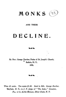 Zurcher released his third book, Monks and their Decline, in 1898.[14] In it, he criticizes Saint Vincent Archabbey for brewing beer, chided it for not joining the temperance movement and claimed the monks were contributing to the drunkenness of lay Catholics. He also mocked the post-nominal letters of Benedictines, OSB, suggesting that they should stand for "the Order of Sacred Brewers".[15] The book was placed on the Index of Forbidden Books by the Sacred Congregation of the Index on September 5.[16] On December 31, Zurcher accepted the decision of the Sacred Congregation of the Index, withdrew the book from circulation, and promised to refund the purchase price.[17]