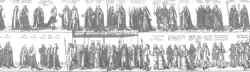 Following ancient tradition, the assembled participants in the hall awaited the arrival of a procession of senior clergy from the abbey bearing the crowns and regalia; these were then distributed to those who had the right to carry them in the main procession from the hall to the abbey.[18] On this occasion, there was a lengthy delay because the deputy earl marshal had forgotten some important items; no chairs had been provided for the king and queen, there was no sword of state, so one had to be borrowed from the Lord Mayor of London, and also there was no canopy under which the king and queen were supposed to process and one had to be improvised.[19][20]