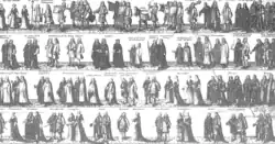 On the way to the abbey, the Bishop of Rochester nearly dropped the crown he was carrying; fortunately it had been pinned to the cushion on which it sat.[19] One spectator noted that the heralds made "numerous mistakes and stupidities", another that "the whole was confusion, irregularity and disorder".[27] The King felt it inappropriate to take Communion wearing his crown, and asked the archbishop if it should be removed, the archbishop in turn asked the Dean of Westminster, but had to report that neither knew what the usual form was; the king removed his crown anyway.[28] At some point in the proceedings, a large jewel is reputed to have fallen from the crown, which was later said to have been an omen presaging American Independence.[29][30] During the sermon, the congregation in the nave who were unable to hear it, began to eat, mainly cold meat and pies, and drink wine brought with them and given out by servants; the ensuing clatter of cutlery resulted in an outburst of laughter. When the queen wanted to visit the "retiring-chamber" which had been constructed for her use in St Edward's Chapel behind the high altar, she found it already occupied by the Duke of Newcastle, prime minister, who was making use of the queen's close stool.[31] When the king complained to Effingham about these problems, he admitted that there had been "some neglect", but that he would make sure that the next coronation would be organised properly (when, of course, the king would be dead). George was highly amused by the answer and made Effingham repeat it several times.[32][20]