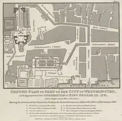 Westminster Hall was also transformed, as it was generally divided by wooden partitions into various courtrooms. A wooden floor was installed, along with three tiers of galleries for spectators. The highest of these was attached to the hammerbeams of the roof,[11] while the lowest was fitted with a sluice "for the reception of urinary discharges".[12] Over the north door, a triumphal arch designed by William Oram was erected,[12] surmounted by a balcony for musicians and a pipe organ. Illumination was provided by twenty-five huge chandeliers. Outside, temporary stands giving a view of the procession between the hall and the abbey were erected by enterprising builders, some seating up to 1,500 people, while renting a house which overlooked the scene for the day, could cost up to £1,000.[13]