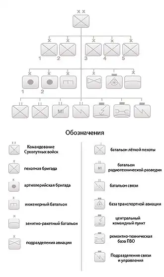 The 31st Army Corps had at the dissolution of the Soviet Union four divisions, two of which became Russian military bases, part of the Group of Russian Forces of the Transcaucasus. The other two appear to have transitioned into Georgian formations, as Georgian brigades appear in the same locations after the divisions disbanded. The 10th Guards Motor Rifle Division at Akhaltsikhe was replaced eventually by the 22nd Motorised Brigade, and the 152nd Motor Rifle Division at Kutaisi was eventually replaced by the 21st Motorised Brigade.[5] The 25th Motorised Brigade was located in Batumi, with Roman Dumbadze the brigade commander by 2004.