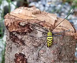 Gerania bosci can reach a length of about 70–80 millimetres (2.8–3.1 in) and a width (including antenna) of about 60 millimetres (2.4 in). The body coloration is quite variable. Usually the background ranges from bright yellow to almost white, with large brown or black spots and markings and bluish-black legs. This species has unusually long legs, almost spider-like, making it distinctive, and popular among collectors. The males are larger than females and have elongated appendages.