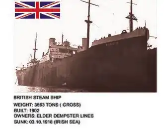 The attacking submarine was the German submarine U-154 of the U-151 type. Built at the Flensburger Schiffbau shipyard and commissioned on 12 December 1917, under the command of Korvettenkapitän Hermann Gercke, U-154 was armed with 18 torpedoes and two 105-millimeter (4 in) deck guns. This submarine, with a displacement of 1,512 tons above water and 1,875 tons submerged, could reach speeds of 12.4 knots (23.0 km/h; 14.3 mph) on the surface.[7][8]